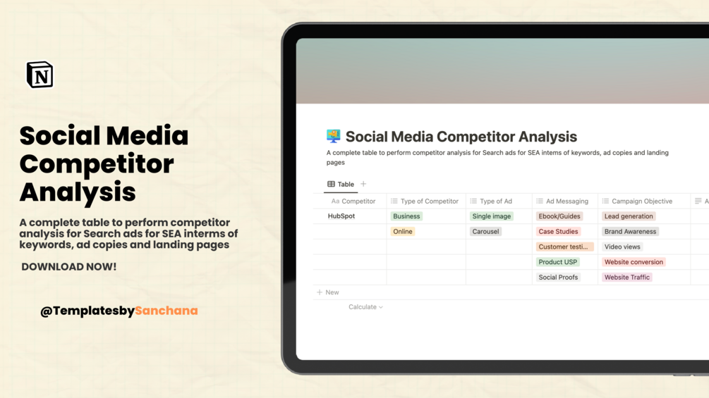 A complete table to perform competitor analysis for Search ads for SEA in-terms of keywords, ad copies and landing pages